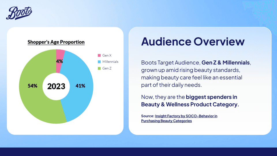 The design centers around a fresh and professional aesthetic that aligns with Boots’ brand identity. I applied a cohesive visual system using blue gradients, clean typography, and rounded layout containers to create an approachable yet premium look. Human-centric imagery was integrated to strengthen emotional connection and relatability, while structured layouts ensure the narrative flows smoothly from insights to strategy. Data visuals and content mockups were styled to remain consistent with the brand’s modern retail feel.