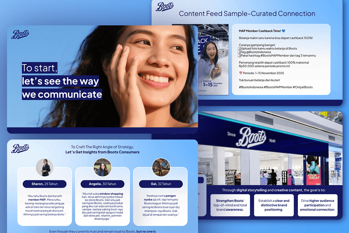 This pitch deck was created to present a comprehensive digital strategy proposal for Boots aimed at strengthening brand trust, awareness, and customer engagement across social media platforms. The deck highlights brand insights, consumer behavior, communication gaps, and proposed strategic initiatives supported by curated content directions and campaign ideas.