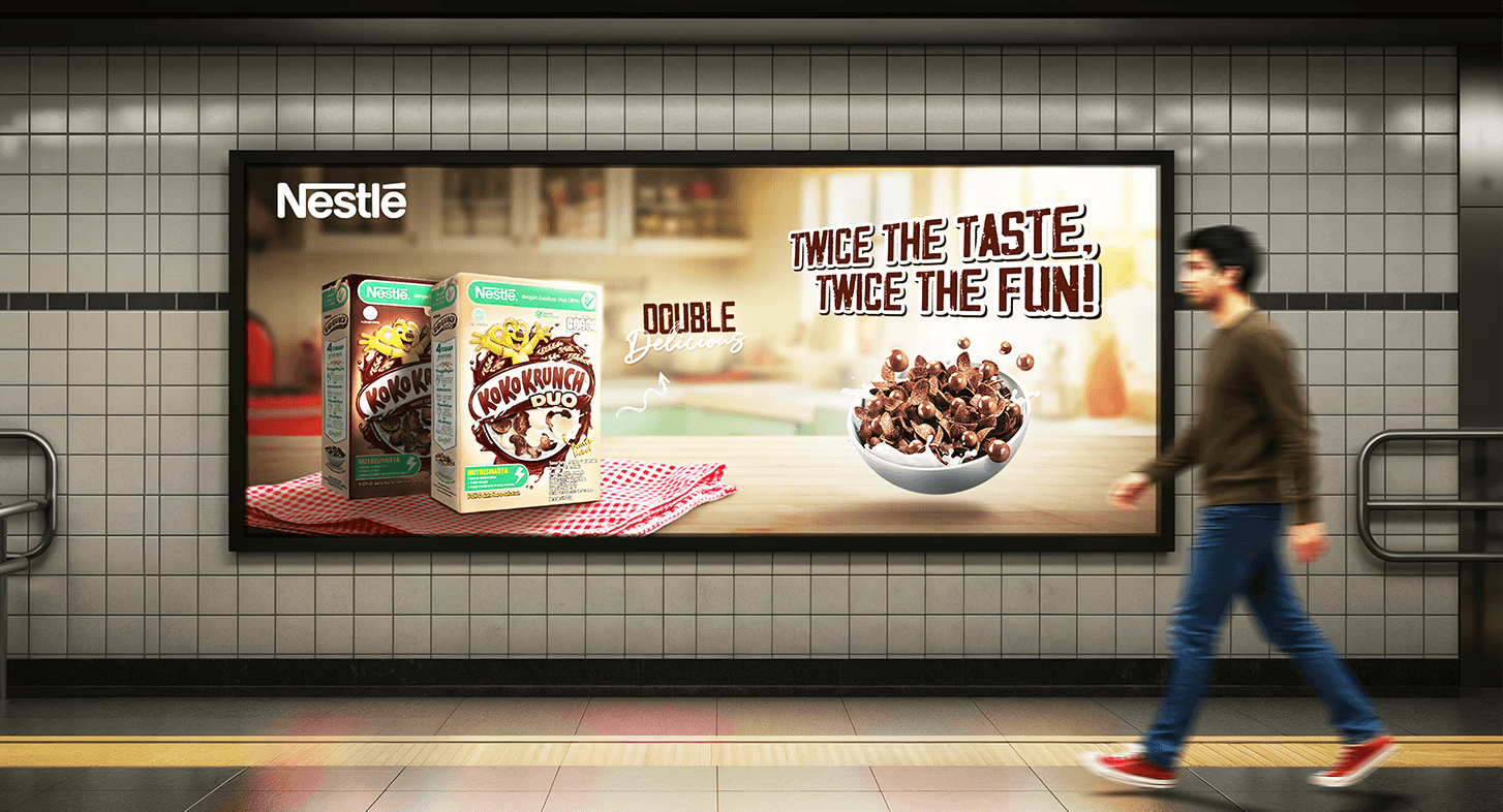 A warm morning kitchen setting was chosen to create a relatable consumption moment, while playful cereal movement and splash effects add energy and a sense of fun. Throughout the design, brand consistency with Nestlé and Koko Krunch DUO’s identity was carefully maintained to ensure a cohesive and impactful campaign visual.