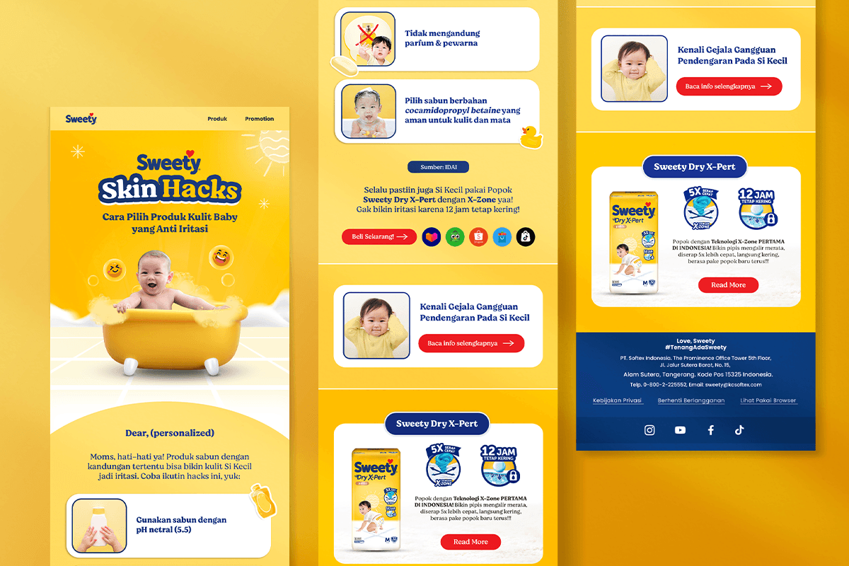 Sweety Dry X-Pert launched a series of educational and promotional email campaigns aimed at engaging moms through relevant parenting insights while driving product awareness and conversions. Each EDM in the series highlights different topics, from baby skincare tips, health awareness, to monthly promotions, all wrapped in a warm, cheerful, and family-friendly brand tone.